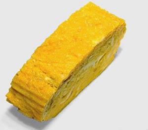 【5】 焼きあがったら、クッキングペーパーを敷いた巻きすで包むと形よくできあがる。