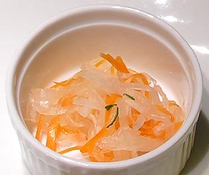 【1】大根は5cmの長さに切り、3mm幅に千切りする。人参も2mmの千切りにする。